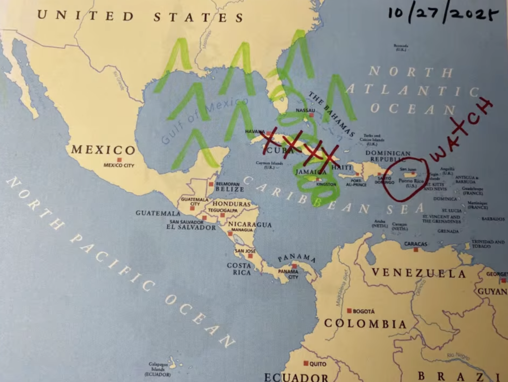 Let’s also remember that on October 27, I drew the map for Hurricane Melissa, and we were working, and there was Nile green, and Melissa continued and destroyed Jamaica, but the target was not Jamaica but Cuba. It entered Jamaica as a category 5 hurricane, but the point was that the same thing could have happened in Cuba, where red Xs were drawn, and the hurricane entered as a category 3 hurricane.